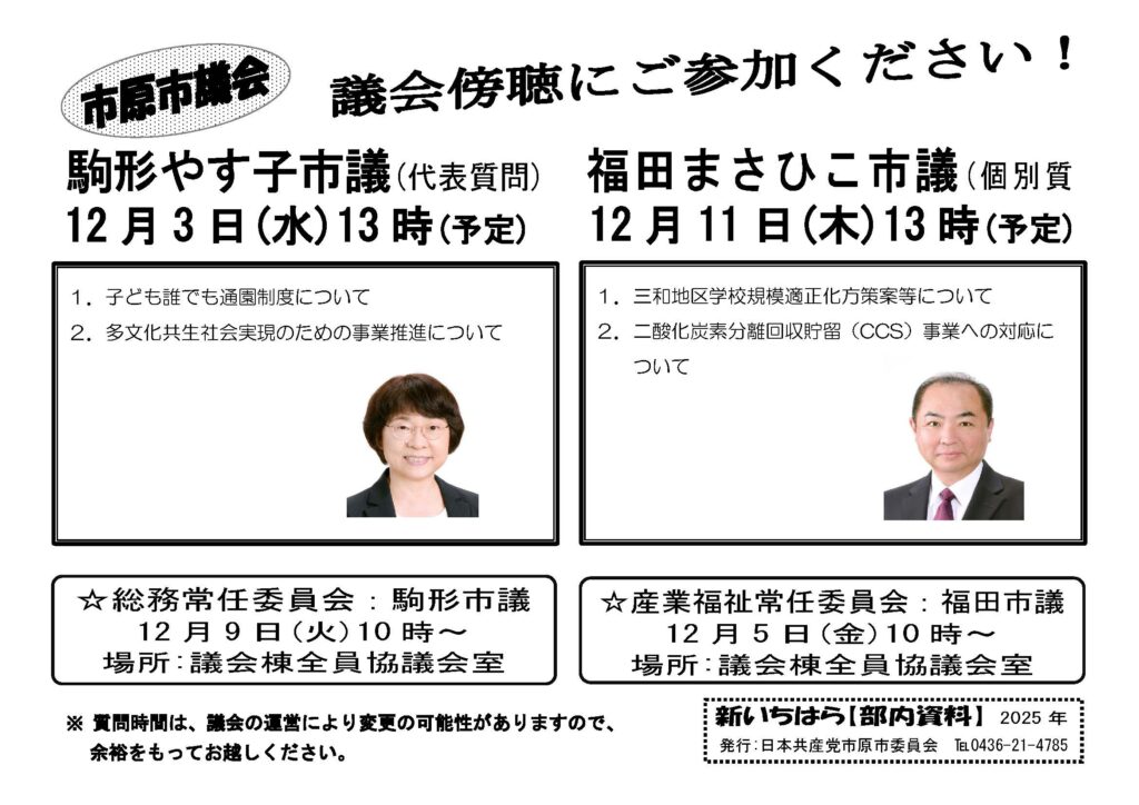 第4回定例会(12月議会)質問の傍聴にお出でください。