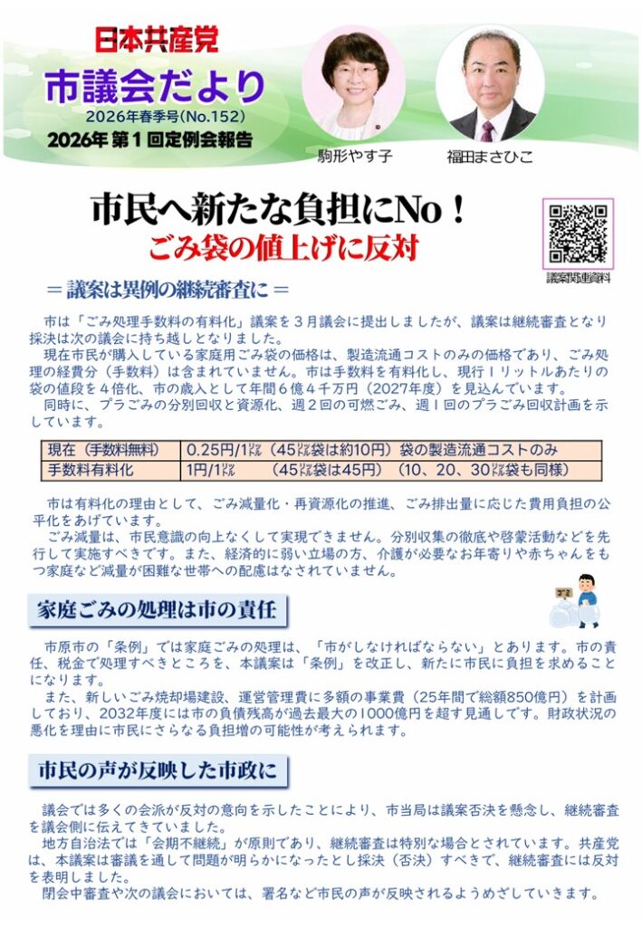 市議会だより(No,152)①市民へ新たな負担No!(ごみ袋値上げに反対)ー議案は異例の継続審査にー