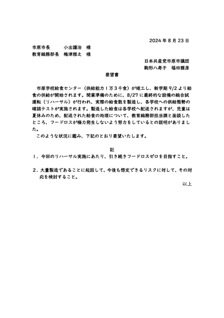 学校給食センターリハーサル時のフードロスに対する要望書(2024/8/23)