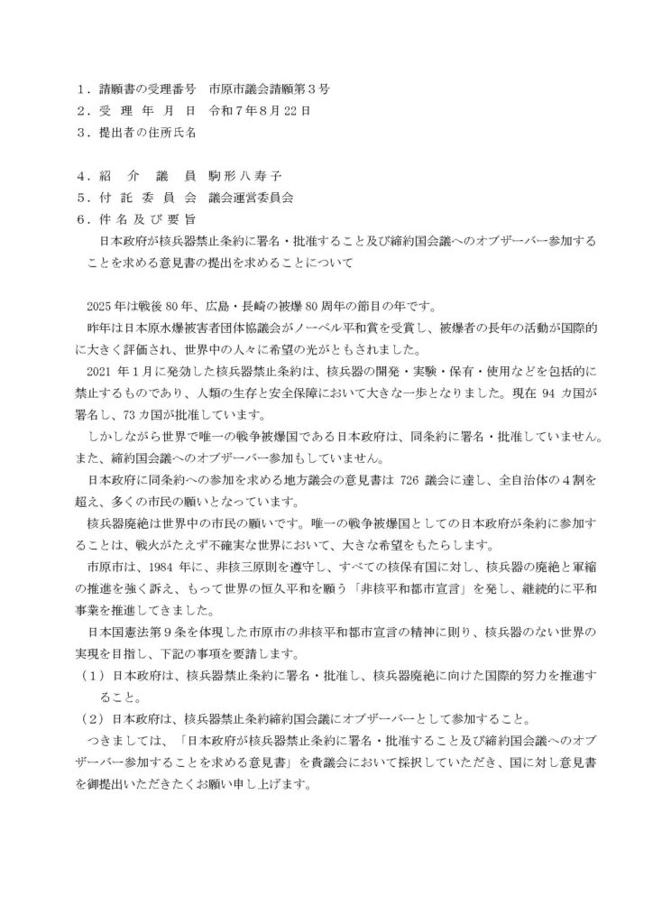 請願提出:「日本政府が核兵器禁止条約に署名・批准すること等を求める意見書の提出を求める」